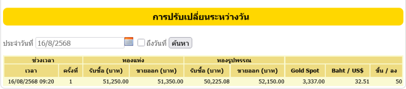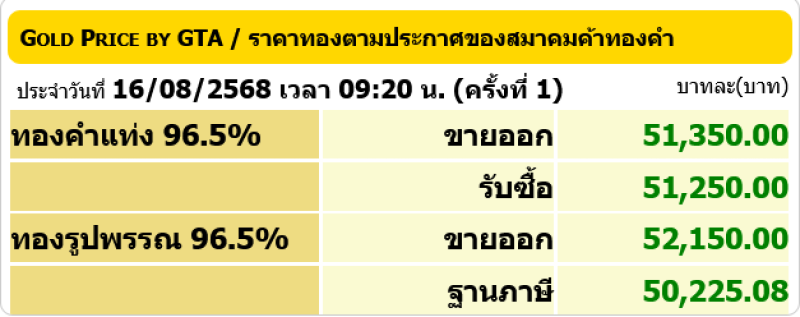 สำหรับราคาทองคำเปิดตลาดประจำวันที่ 16 สิงหาคม 2568 เปิดตลาดปรับขึ้น50 บาท ในครั้งที่1 โดยทองรูปพรรณขายออกบาทละ 52,150 ตามข้อมูลจากเว็บไซต์ของ สมาคมค้าทองคำ เมื่อเวลา 09.20 น.