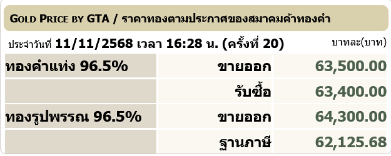 สำหรับราคาทองคำเปิดตลาดประจำวันที่ 11 พฤศจิกายน 2568 เปิดตลาดปรับขึ้น 950 บาท ในครั้งที่1 ต่อมามีการปรับขึ้น-ลง รวมแล้ว 20 ครั้ง โดยทองรูปพรรณขายออกบาทละ 64,300 ตามข้อมูลจากเว็บไซต์ของ สมาคมค้าทองคำ เมื่อเวลา 16.28 น.
