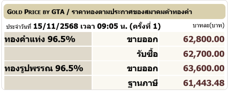 สำหรับราคาทองคำเปิดตลาดประจำวันที่ 15 พฤศจิกายน 2568 เปิดตลาดปรับลง 1,150 บาท ในครั้งที่1 โดยทองรูปพรรณขายออกบาทละ 63,600 ตามข้อมูลจากเว็บไซต์ของ สมาคมค้าทองคำ เมื่อเวลา 09.05 น.