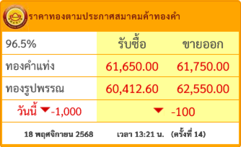 สำหรับราคาทองคำเปิดตลาดประจำวันที่ 18 พฤศจิกายน 2568 เปิดตลาดปรับลง 850 บาท ในครั้งที่1 ต่อมีการปรับขึ้น-ลง รวมแล้ว 14 ครั้ง โดยทองรูปพรรณขายออกบาทละ 62,550.00 ตามข้อมูลจากเว็บไซต์ของ สมาคมค้าทองคำ เมื่อเวลา 13:21 น.(ครั้งที่ 14)