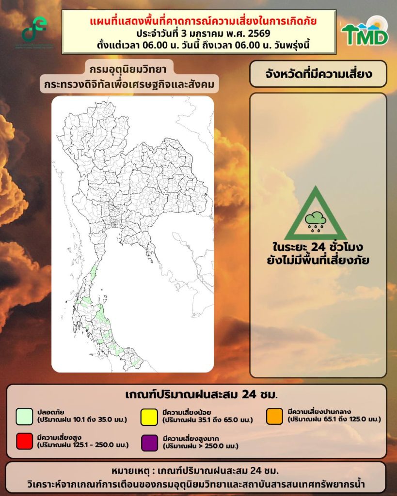 เนื่องจากบริเวณความกดอากาศสูงหรือมวลอากาศเย็นกำลังค่อนข้างแรงระลอกใหม่จากประเทศจีนได้แผ่ลงมาปกคลุมประเทศไทยตอนบนและภาคใต้ตอนบนแล้ว ขอให้ประชาชนในบริเวณดังกล่าวดูแลรักษาสุขภาพเนื่องจากสภาพอากาศที่หนาวเย็นลง รวมทั้งระวังอันตรายจากอัคคีภัยเนื่องจากสภาพอากาศแห้งและลมแรง