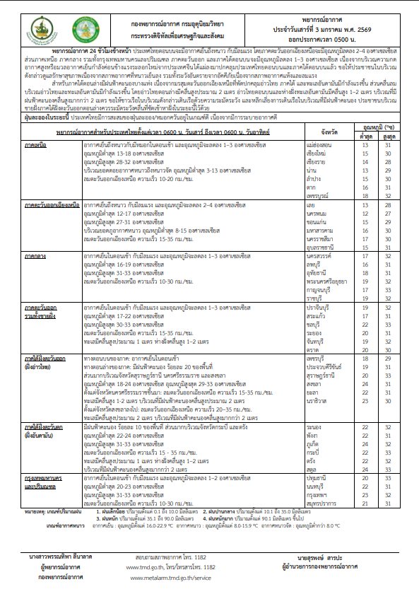 วันที่ 2 ม.ค.2568 กรมอุตุนิยมวิทยา พยากรณ์อากาศ 24 ชั่วโมงข้างหน้า ประเทศไทยตอนบนจะมีอากาศเย็นถึงหนาว กับมีลมแรง โดยภาคตะวันออกเฉียงเหนือจะมีอุณหภูมิลดลง 2–4 องศาเซลเซียส ส่วนภาคเหนือ ภาคกลาง รวมทั้งกรุงเทพมหานครและปริมณฑล ภาคตะวันออก และภาคใต้ตอนบนจะมีอุณหภูมิลดลง 1–3 องศาเซลเซียส