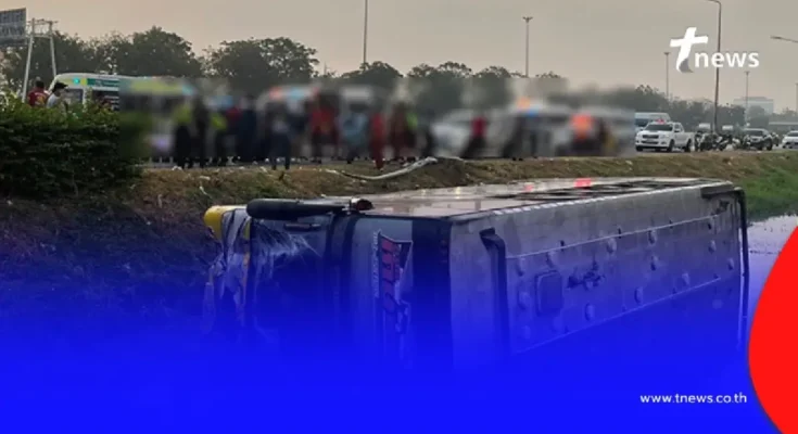 อุบัติเหตุเช้าวันนี้ รถบัสรับ-ส่งพนักงานพลิกตะแคง ตกคูน้ำถนนสายเอเชีย หน้าบิ๊กซีอยุธยา ผู้โดยสารบาดเจ็บหลายราย