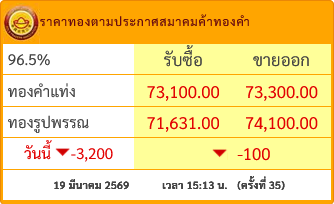ราคาทองคำประจำวันที่ 19 มี.ค.2569 ร่วงแรง 3,200บาท โดยทองรูปพรรณขายออกที่บาทละ 74,100.00 บาท อ้างอิงข้อมูลล่าสุดจาก สมาคมค้าทองคำ ที่เผยแพร่ผ่านทางเว็บไซต์ เมื่อเวลา 15:13 น.ปรับ(ครั้งที่ 35)