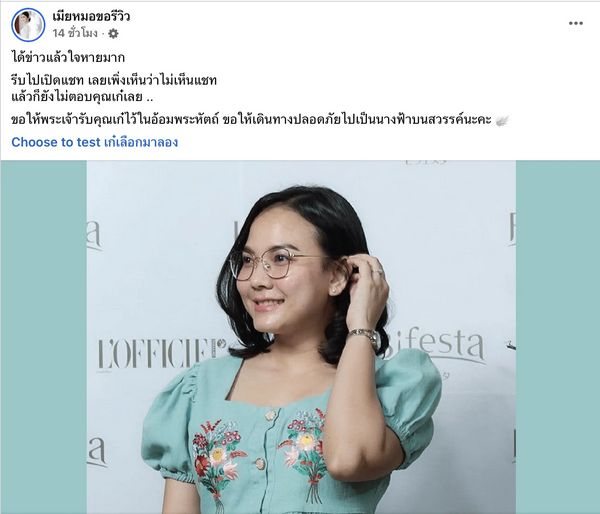 เมียหมอขอรีวิว โพสต์ว่า ได้ข่าวแล้วใจหายมาก รีบไปเปิดแชท เลยเพิ่งเห็นว่าไม่เห็นแชท แล้วก็ยังไม่ตอบคุณเก๋เลย ขอให้พระเจ้ารับคุณเก๋ไว้ในอ้อมพระหัตถ์ ขอให้เดินทางปลอดภัยไปเป็นนางฟ้าบนสวรรค์นะคะ