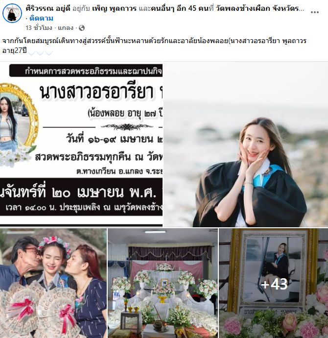วันที่ 21 เมษายน 2569 ที่วัดพลงช้างเผือก มีรายงานข่าวเศร้าในวงการคอนเทนต์ครีเอเตอร์ หลัง พลอย อรอารียา พูลถาวร หรือที่หลายคนรู้จักในชื่อ พลอยชอบถ่ายรูป อินฟลูเอนเซอร์สาวสายไลฟ์สไตล์และการถ่ายภาพ วัย 27 ปี เสียชีวิตกะทันหันจากอุบัติเหตุ สร้างความตกใจและความเสียใจให้กับผู้ติดตาม รวมถึงคนใกล้ชิดเป็นอย่างมาก